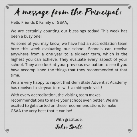 GSAA is an accredited high school offering college-prep courses with a uniquely Seventh-day Adventist perspective. Gem State Adventist Academy is a member of the General Conference of Seventh Day Adventists. At GSAA Students are given opportunities to engage in service and develop a life-long passion for helping others and giving back to their community. Students are trained for leadership, gaining knowledge and experience that will help them be successful leaders in their family, church and career. Above all else, GSAA strives to prepare students for eternity focusing our academics, athletics and extra-curricular activities by encouraging the development of a relationship with Jesus Christ.